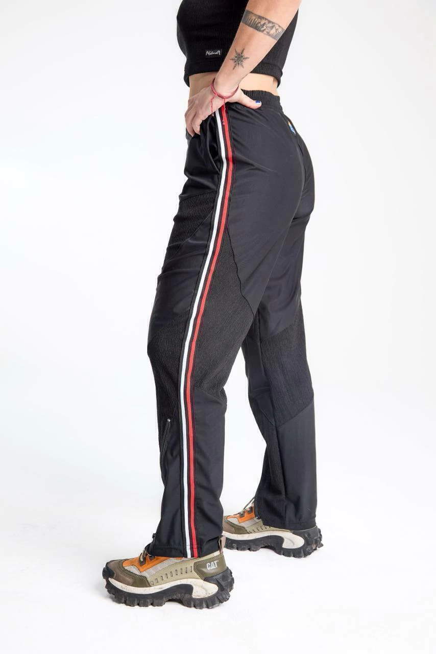 Pantalón de microfibra nylon stretch con recortes en crepe plisado elastizado en delantera y trasera. Con banda tejida de puño y cierre de 23 cm en botamanga. Cintura de 4 cm con elastico con cordon interno para ajustar y bolsillos laterales.